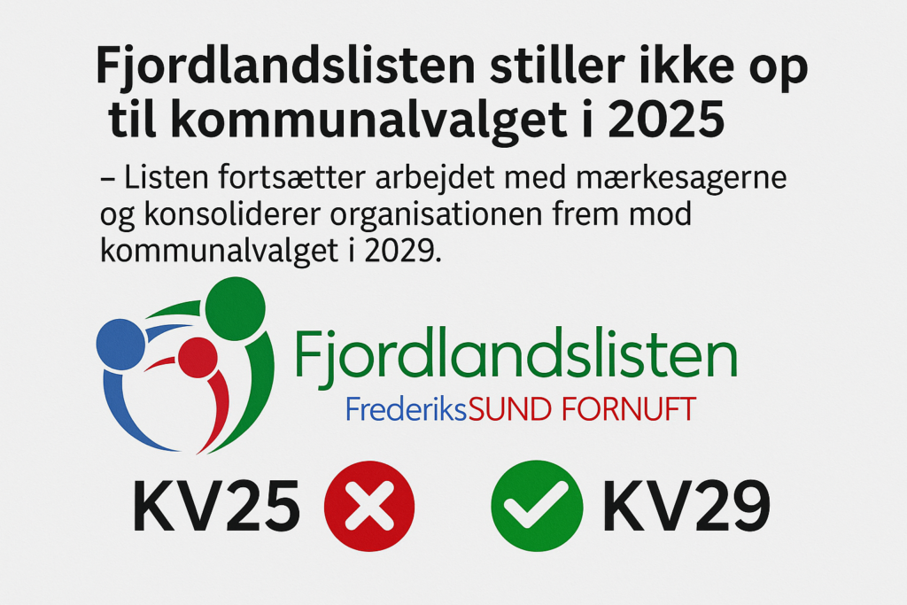 Efter fire år i byrådet har Fjordlandslisten besluttet ikke at genopstille ved det kommende kommunalvalg i 2025. Ved valget i 2021 opnåede vi et stærkt resultat og var blot 37 stemmer fra at sikre os et andet mandat. Det var et tydeligt signal om lokal opbakning og et ønske om nye stemmer i kommunalpolitikken.